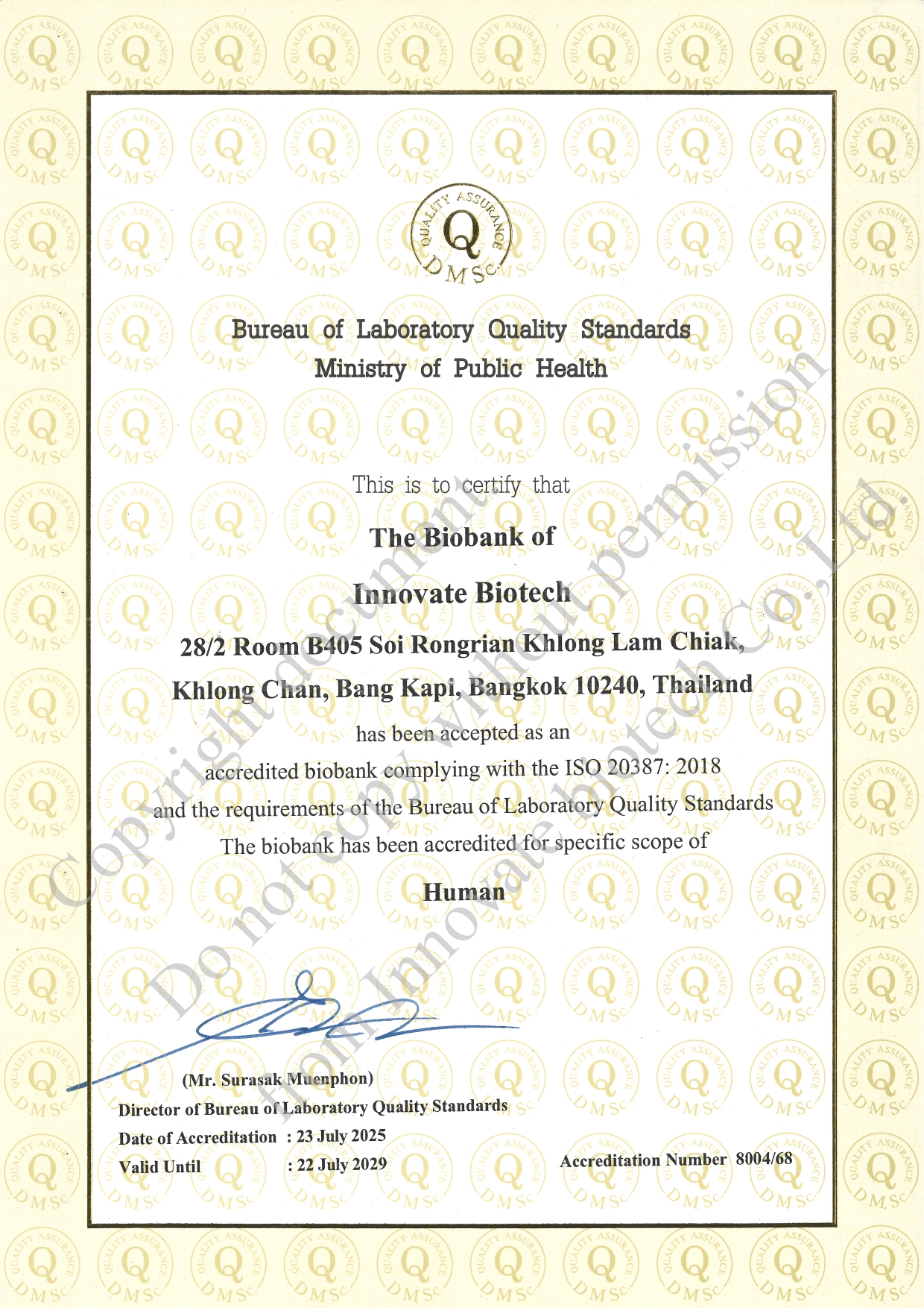 At Fresh Mediq Global Clinic, we are proud to collaborate with Innovate Biotech, a stem cell laboratory that has achieved the highest national accreditation for biobanking in Thailand. The lab is officially certified by the Bureau of Laboratory Quality Standards, Ministry of Public Health, under the internationally recognized ISO 20387:2018 standard for biobanking.